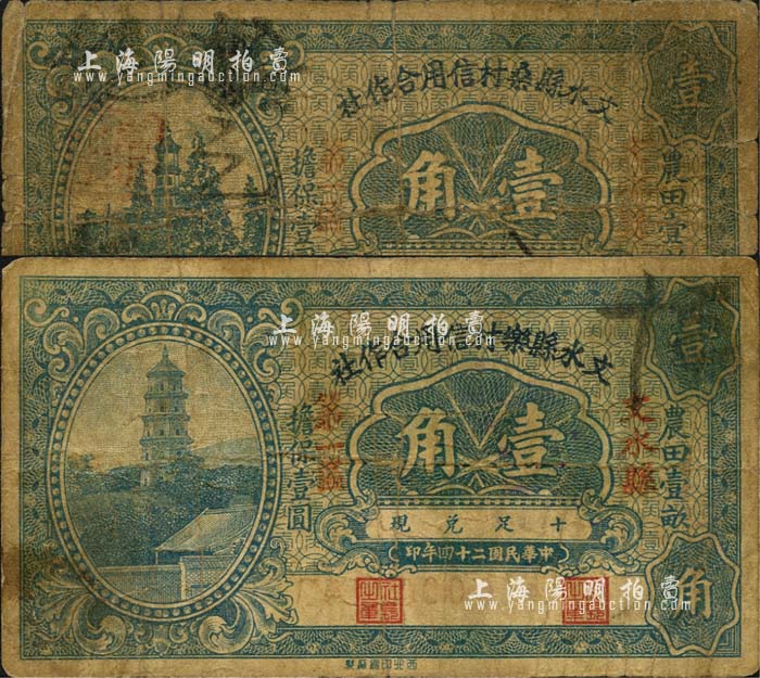 民国二十四年(1935年)文水县乐村信用合作社壹角、文水县桑村信用合作社壹角共2枚不同,均上印“农田壹亩担保壹圆”字样;森本勇先生藏品,七成新