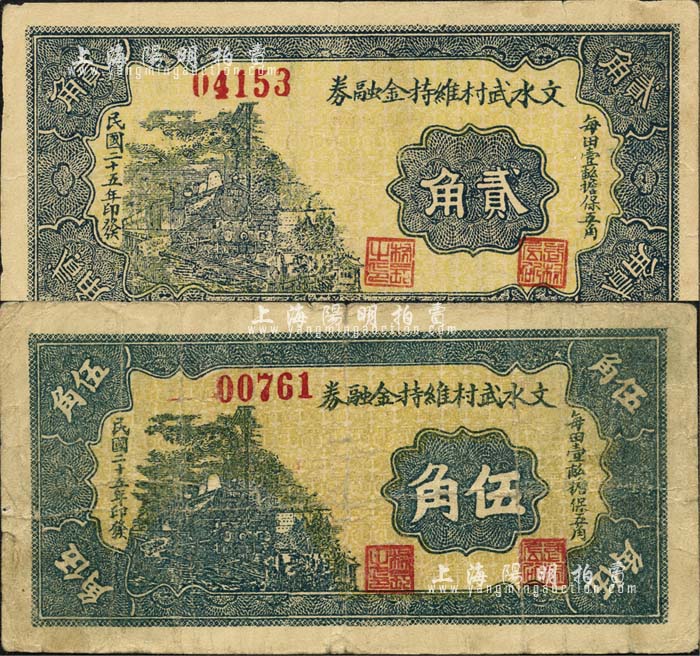 民国二十五年(1936年)文水武村维持金融券贰角、伍角共2枚不同,均背盖“武村公立斗局代兑”红字;森本勇先生藏品,七至八成新
