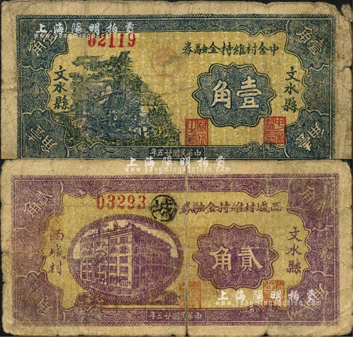 民国廿五年(1936年)文水县中舍村维持金融券壹角、文水县西城村维持金融券贰角共2枚不同,均背印“全村地亩担保”字样;森本勇先生藏品,七成新
