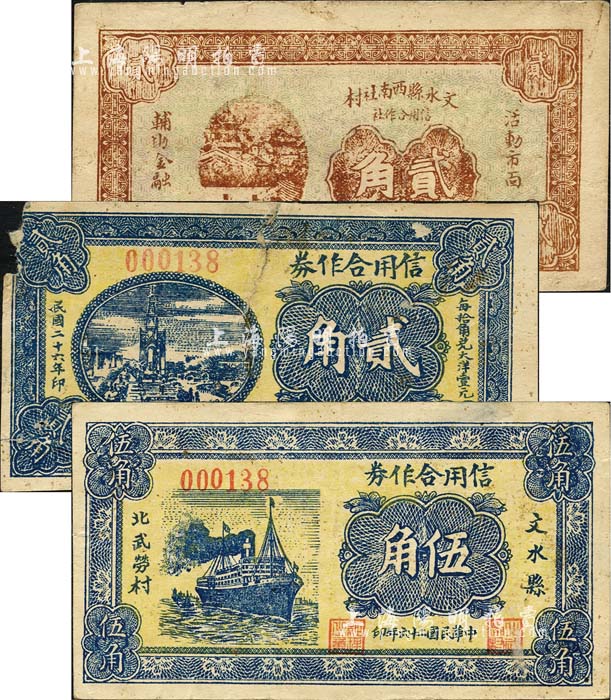 民国二十六年(1937年)文水北武劳村信用合作券贰角、伍角,文水县西南社村信用合作社贰角,合计共3枚不同;森本勇先生藏品,其中1枚有缺损,六至八成新