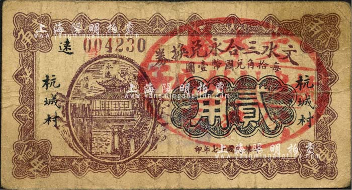 民国十七年(1928年)文水三合永兑换券贰角,加盖“文水县杭城村村公所借发券”戳记,属信用合作券时代之改造券;森本勇先生藏品,七成新