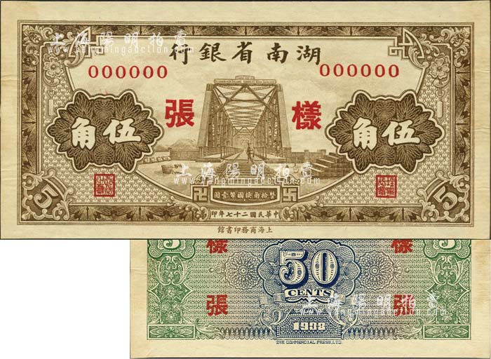 民国二十七年(1938年)湖南省银行商务版棕色铁桥图伍角样张,正背共2枚;图案花纹清晰美观;森本勇先生藏品,源于江南听雨轩之旧藏,少见,未折九五成新(注:是项纸币,其所见正票多为历史同时期之老假票,花纹粗劣,有兴趣的钞友可对照此样张,值得借鉴和分辨!)