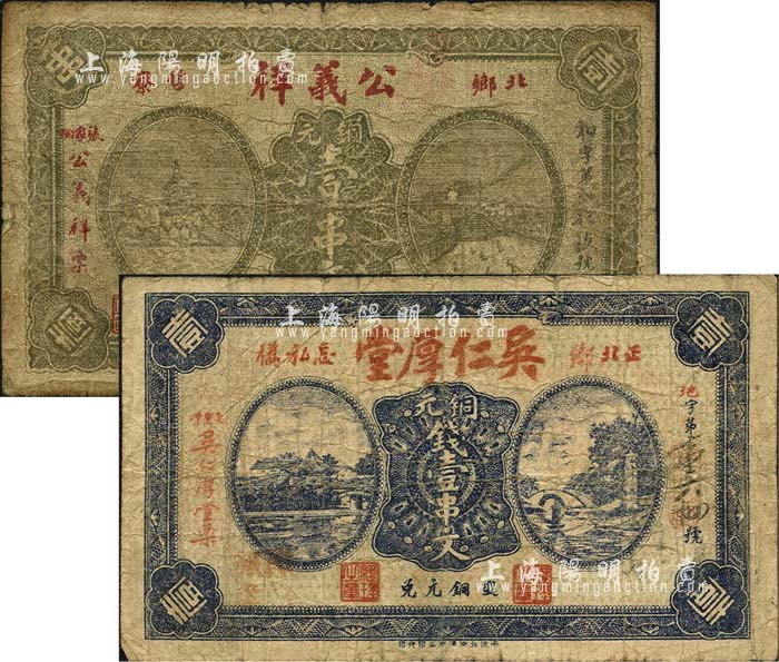 平江县北乡钱票2种,详分:公义祥铜元壹串文、吴仁厚堂铜元壹串文,均上印风景图;森本勇先生藏品,七成新