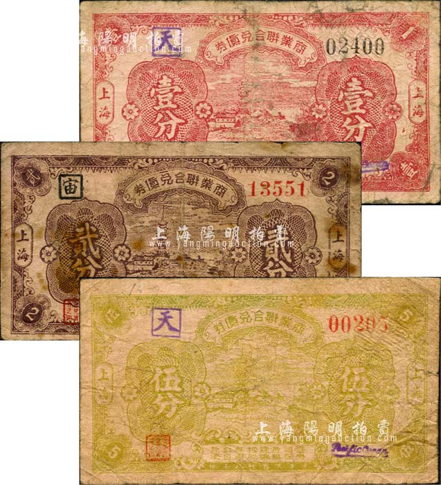 民国廿八年(1939年)上海商业联合兑货券壹分、贰分、伍分共3枚全套,由八家商店联合发行;森本勇先生藏品,六成新