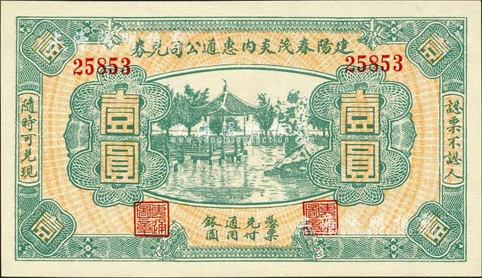 民国无年份(福建)建阳春茂炎内惠通公司兑券壹圆,上印杭州西湖风景;森本勇先生藏品,全新
