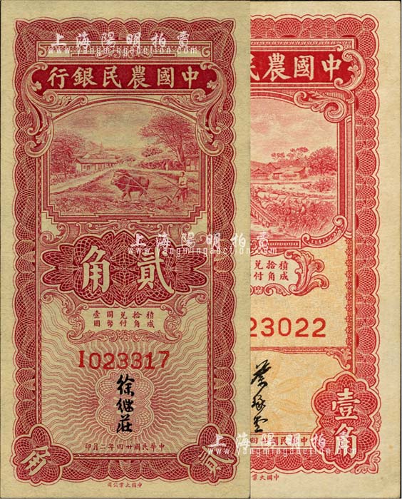 民国廿四年(1935年)中国农民银行纸币2种,详分:第一版红色牛耕地贰角,徐继庄签名;第二版壹角,叶琢堂签名;九八成新