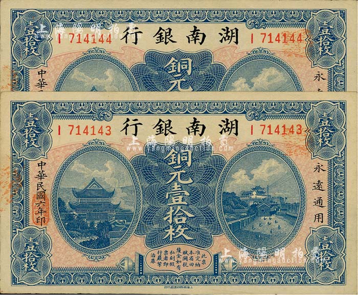 民国六年(1917年)湖南银行铜元壹拾枚共2枚连号,九八成新