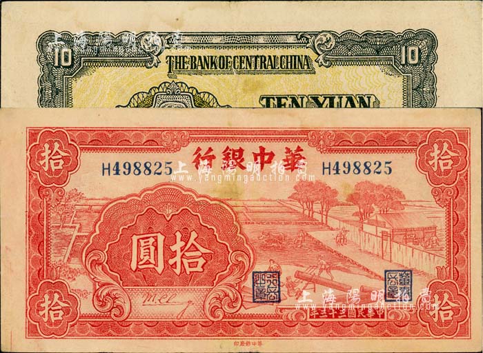 民国三十三年(1944年)华中银行红色锯木图拾圆,小号码券,已属较佳品相,八五成新