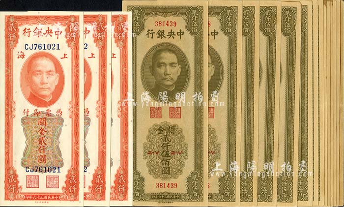 民国三十六年(1947年)中央银行关金共17枚,内含:美钞版红贰仟圆3枚连号;中华版贰仟伍佰圆14枚,部分连号;海外回流品,九至九八成新
