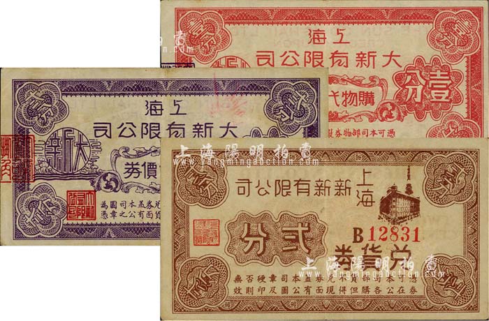 老上海孤岛时期代价券3种,详分:上海大新有限公司购物代价券壹分、贰分,上海新新有限公司兑货券贰分,此二家乃属老上海四大百货公司;香港藏家出品,八成新