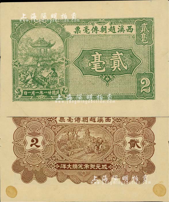 民国廿一年(1932年)西溪赵朝传毫票贰毫,广东潮安地区钱庄钞票,当属未正式发行之试印票,九成新