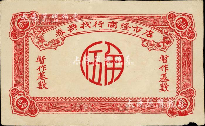 店市隆商行找换券(1948-49年)暂作基数伍角,广东汕头地区金圆券时代地方辅币,边有小损,八成新
