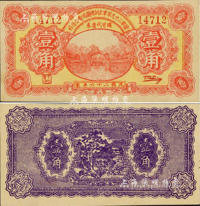 民国二十六年(1937年)陆军第二十九军军士训练团消费合作社壹角,上印军校大门图;陆军二十九军因“卢沟桥事变”而闻名,军长宋哲元、副军长佟麟阁、师长赵登禹都是著名的抗日英雄,此券发行于卢沟桥事变当年,历史意义重大;少见,九五成新(注:此券乃2010年北京华夏秋拍之Lot9229号拍品,昔年成交价即以高达人民币21280元。)