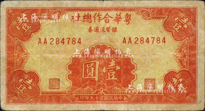 民国三十九年(1950年)粤华合作总社银币流通券壹圆,AA字轨,此券乃国民党12军团司令胡琏将军戍守金门岛时所发行;少见,七五成新