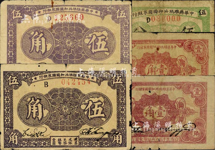 中华苏维埃共和国国家银行纸币5枚,详分:1932年伍分,D字轨;1932年壹角2枚,分别为无字轨和C字轨;1933年伍角2枚,分别为B字轨和D字轨;台湾藏家出品,原票六至七成新