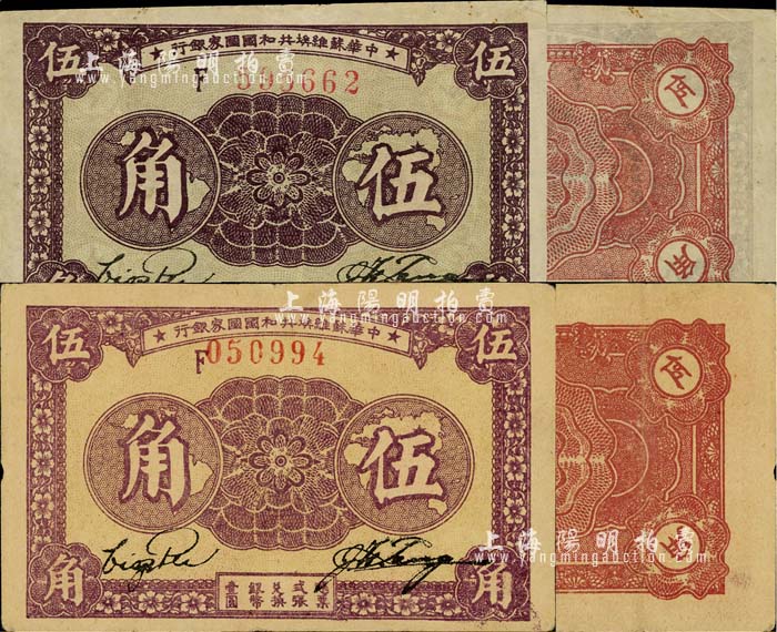 1933年中华苏维埃共和国国家银行伍角共2种不同,均为F字轨,其中1枚为厚纸版(正面紫色印刷)、另1枚为薄纸版(正面紫褐色印刷),且背面颜色亦各有差异;前辈藏家出品,八五成新