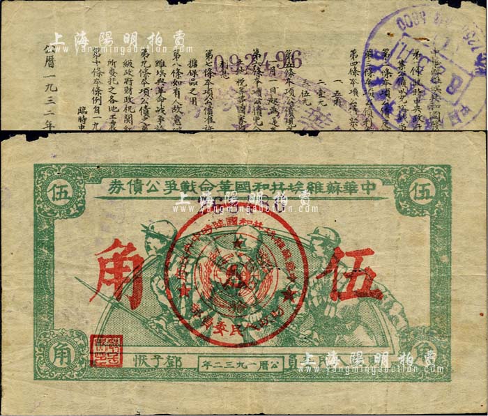 1932年中华苏维埃共和国革命战争公债券(第一期)伍角,深绿色印刷,正面由财政人民委员邓子恢签名,背印临时中央政府主席毛泽东、副主席项英、张国焘签署之发行条例;此券一般所见均为第二期单面印刷券,而此种第一期存世颇为稀见;江南前辈藏家出品,少见,七五成新