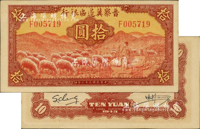 民国三十二年(1943年)晋察冀边区银行红色牧羊图拾圆,F字轨第二种签名券;河北前辈藏家出品,九八成新
