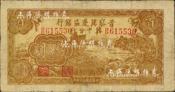 民国三十四年(1945年)晋察冀边区银行冀中分行收割图壹百圆,河北前辈藏家出品,少见,七成新