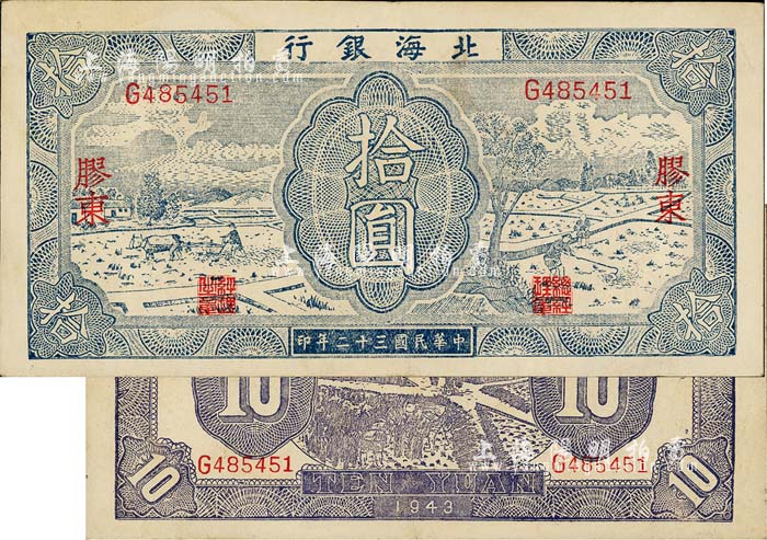 民国三十二年(1943年)北海银行蓝色耕作图拾圆,胶东地名,英文单字轨,背印紫色收割图,难得好品相,八五成新