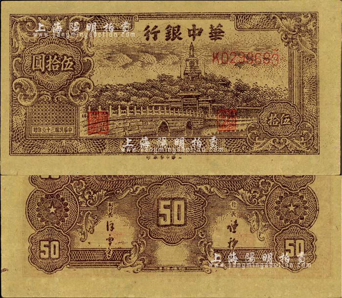 民国三十五年(1946年)华中银行深褐色北海图伍拾圆,黄布纹纸印刷;江南藏家出品,九八成新