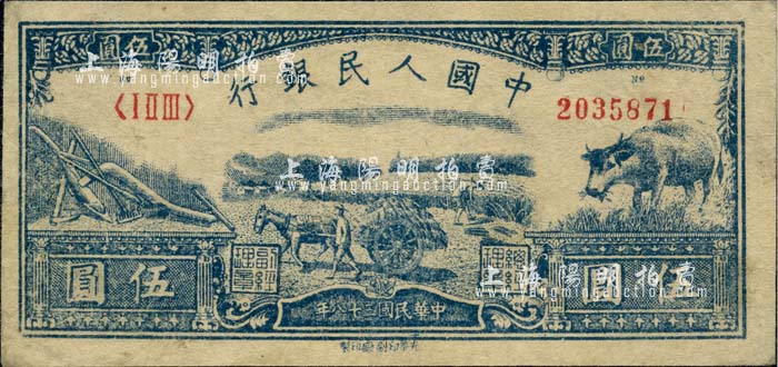 第一版人民币光华版“水牛图”伍圆,八至八五成新