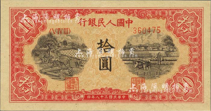 第一版人民币“锯木与耕地图”拾圆,九五成新