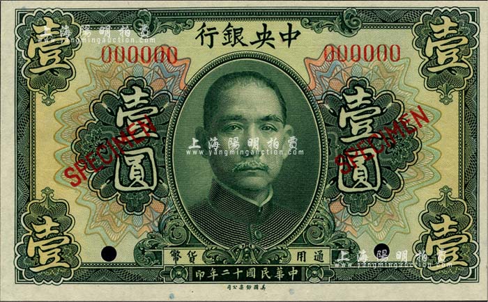 民国十二年(1923年)中央银行第一版绿色壹圆样本券,尺寸123×76mm,全新