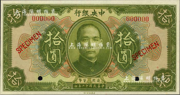 民国十二年(1923年)中央银行第一版绿色拾圆样本券,尺寸158×84mm,全新