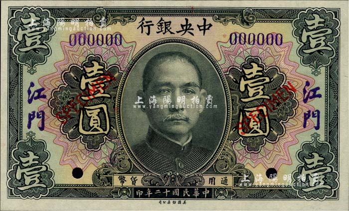 民国十二年(1923年)中央银行黑色壹圆样本券,江门地名,全新