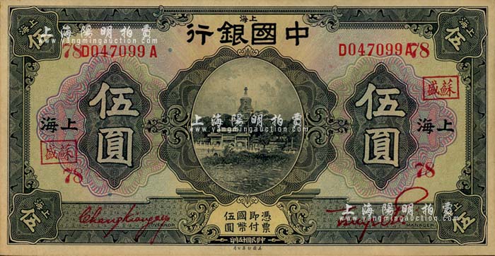 民国十五年(1926年)中国银行美钞版伍圆,上海地名,前后字轨,张嘉璈·贝祖诒红色签名,加印领券“苏盛·78”字样;江南雁门堂藏品,上佳品相,九五成新