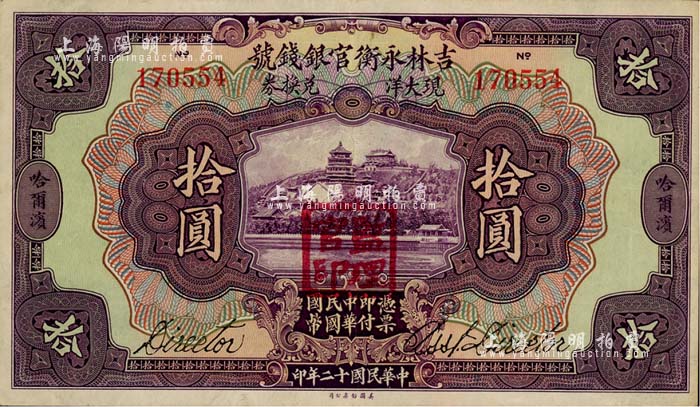 民国十二年(1923年)吉林永衡官银钱号现大洋兑换券拾圆,哈尔滨地名,盖有“监理官印”;江南雁门堂藏品,八五成新