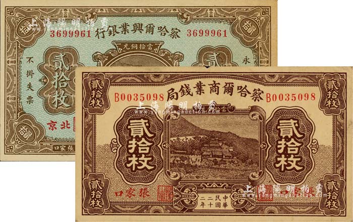 察哈尔省钞2种,详分:察哈尔兴业银行1926年当拾铜元贰拾枚,北京·张家口地名;察哈尔商业钱局1933年贰拾枚,张家口地名;江南雁门堂藏品,八至未折九成新