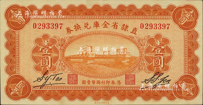 民国十七年(1928年)直隶省金库兑换券壹圆,上印天津金刚桥,背印发行条例及盖“直隶财政厅印”;江南雁门堂藏品,九五成新