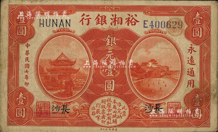 民国七年(1918年)裕湘银行银元壹圆,长沙地名,军阀张敬尧督湘时代发行;江南雁门堂藏品,近八成新