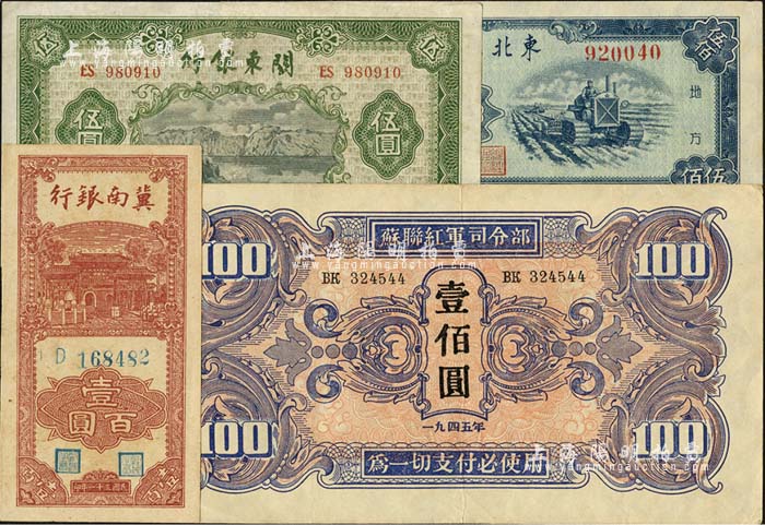 区票4种,详分:冀南银行1942年竖式壹百圆;关东银行1948年伍圆;东北银行1950年伍佰圆;苏联红军司令部1945年壹佰圆;江南雁门堂藏品,八五至九六成新