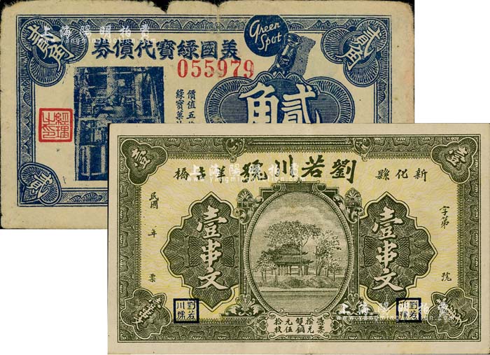 民间钞票2种,详分:(新化县)刘若川号1934年壹串文,上印古亭图,背印风雨桥;(上海)美国绿宝代价券1940年贰角;七至八五成新