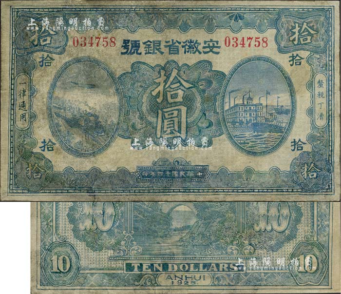 民国十四年(1925年)安徽省银号拾圆,台湾藏家出品,少见,有修补,六成新