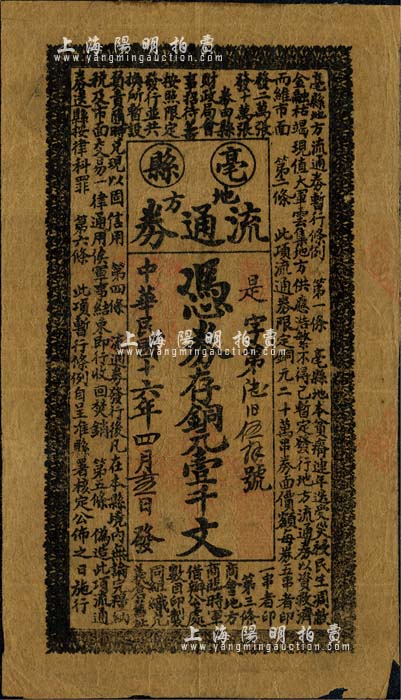 民国十六年(1927年)亳县地方流通券铜元壹千文,上印流通券暂行条例,其内容提及军事,或与孙殿英匪军祸害亳州相关;安徽纸币之罕见品,右下角微损,七五成新
