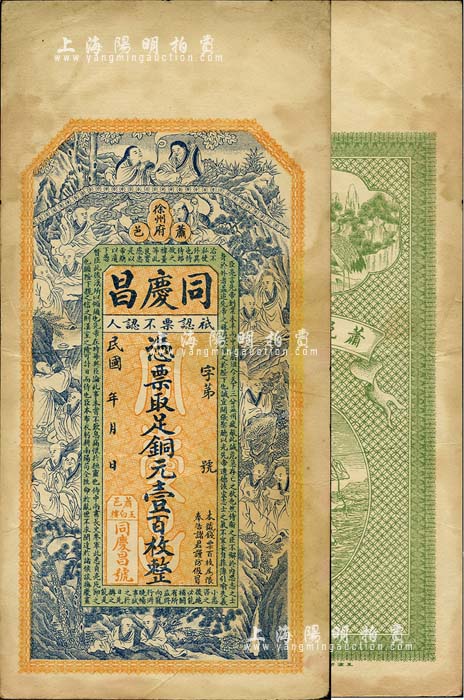 民国年(徐州府萧县)同庆昌铜元壹百枚,上印和合二仙、十八罗汉和诸葛亮《前出师表》,背印双鹤和刘海戏金蟾图,由谈梅庆绘稿,形制精美;台湾藏家出品,八成新