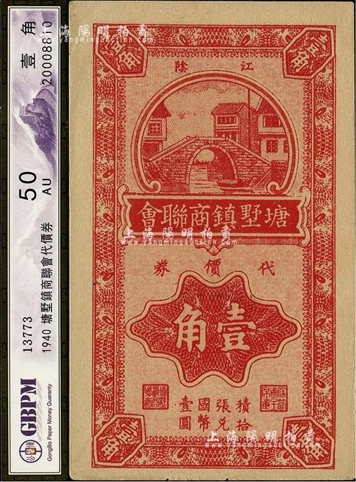1940年(江阴)塘墅镇商联会代价券壹角,抗战时期江苏省地方商会辅币券,少见,已评级,九五成新