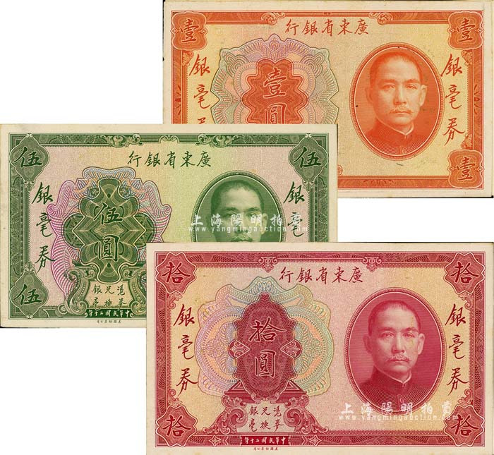 民国二十年(1931年)广东省银行银毫券壹圆、伍圆、拾圆仅正面试模票共3枚不同,均张贴于美国钞票公司档案卡纸之上,背有铅笔书写档案英文,雕刻版手感强烈;海外藏家出品,九八成新