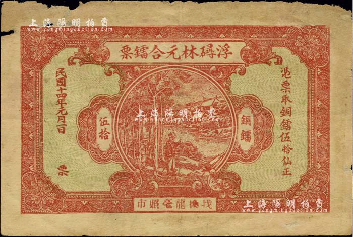 民国十四年(1925年)浮𥖇林元合镭票铜镭伍拾仙,广东潮汕地区民间钞票,少见,有小破损,七成新