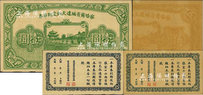 民国十八年(1929年)察哈尔省编遣欠饷定期库券壹圆,属无职章和号码之半成品券,九五成新(另附送伍圆券1枚,有裂口及褪色)