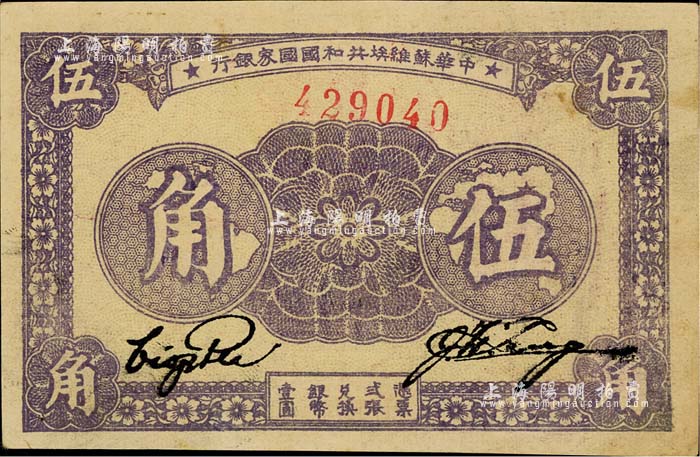 1933年中华苏维埃共和国国家银行伍角,无字轨单号码,台湾藏家出品,未折九五成新