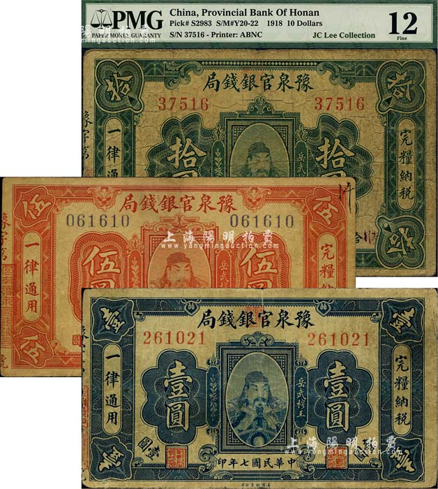 民国七年(1918年)豫泉官银钱局壹圆、伍圆、拾圆共3枚全套,上印武穆王岳飞像;北美畅詠堂藏品,其中1枚有评级,七至七五成新