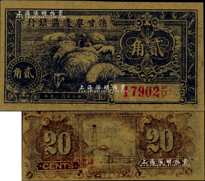 民国三十年(1941年)陕甘宁边区银行贰角,背面图案印刷移位;台湾藏家出品,九八成新