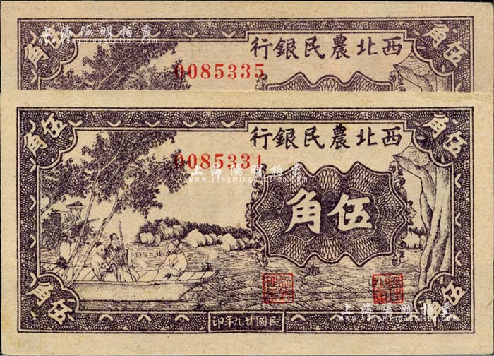 民国廿九年(1940年)西北农民银行紫色古人游船图伍角共2枚,台湾藏家出品,九八成新