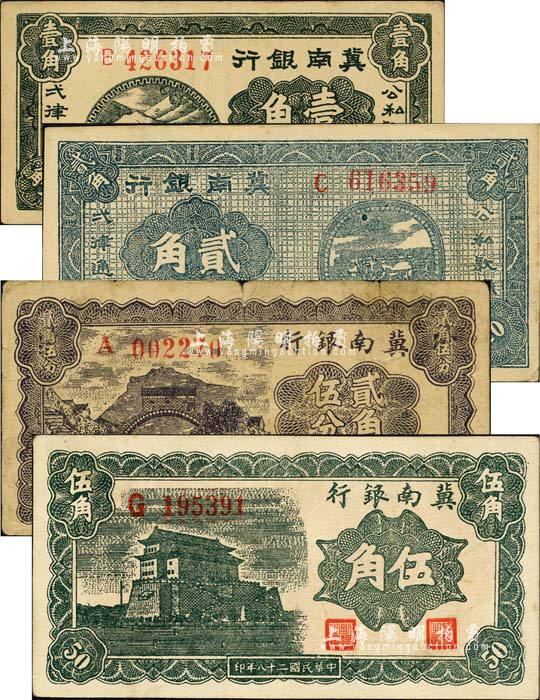 1939年冀南银行壹角、贰角、贰角伍分、伍角共4种不同,台湾藏家出品,除1枚七成新外,其余约九至九五成新