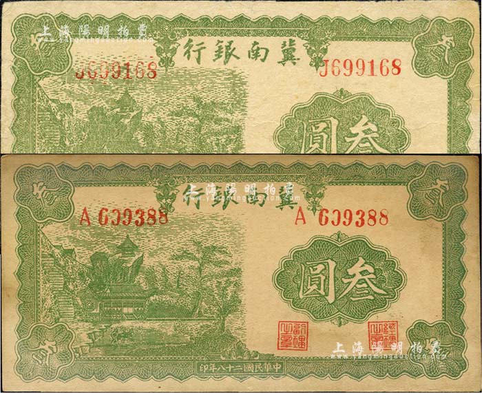 民国二十八年(1939年)冀南银行叁圆共2枚,不同冠字且背面颜色亦有不同;台湾藏家出品,八至八五成新